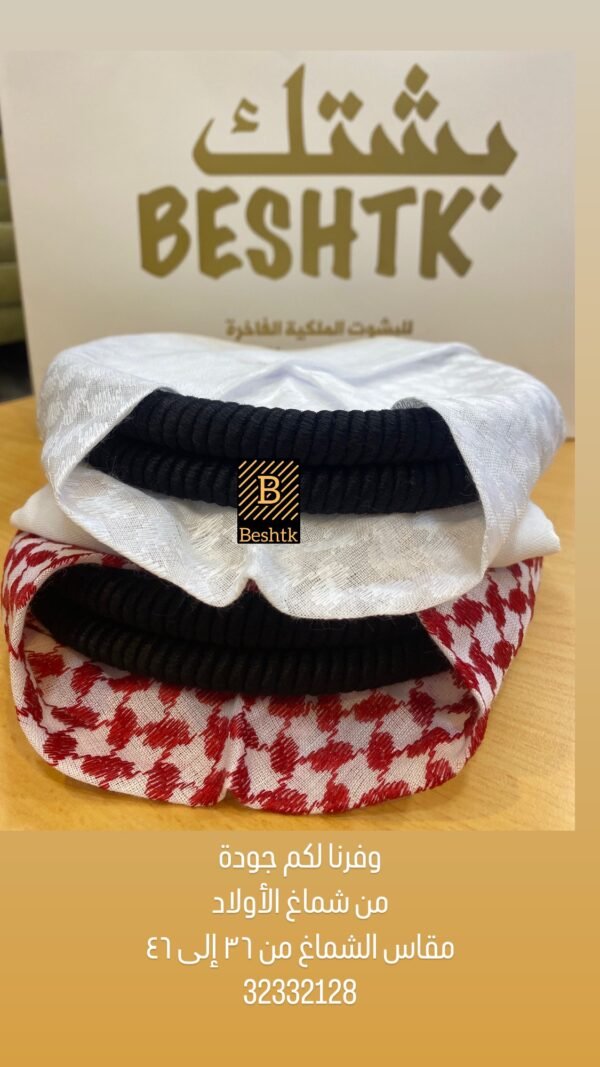 شماغ أحمر للأولاد مشبوكة مع العقال والقحفية "الطاقية"، جودة ممتازة، جميلة وراقية في اللبس، مناسبة للاولاد.